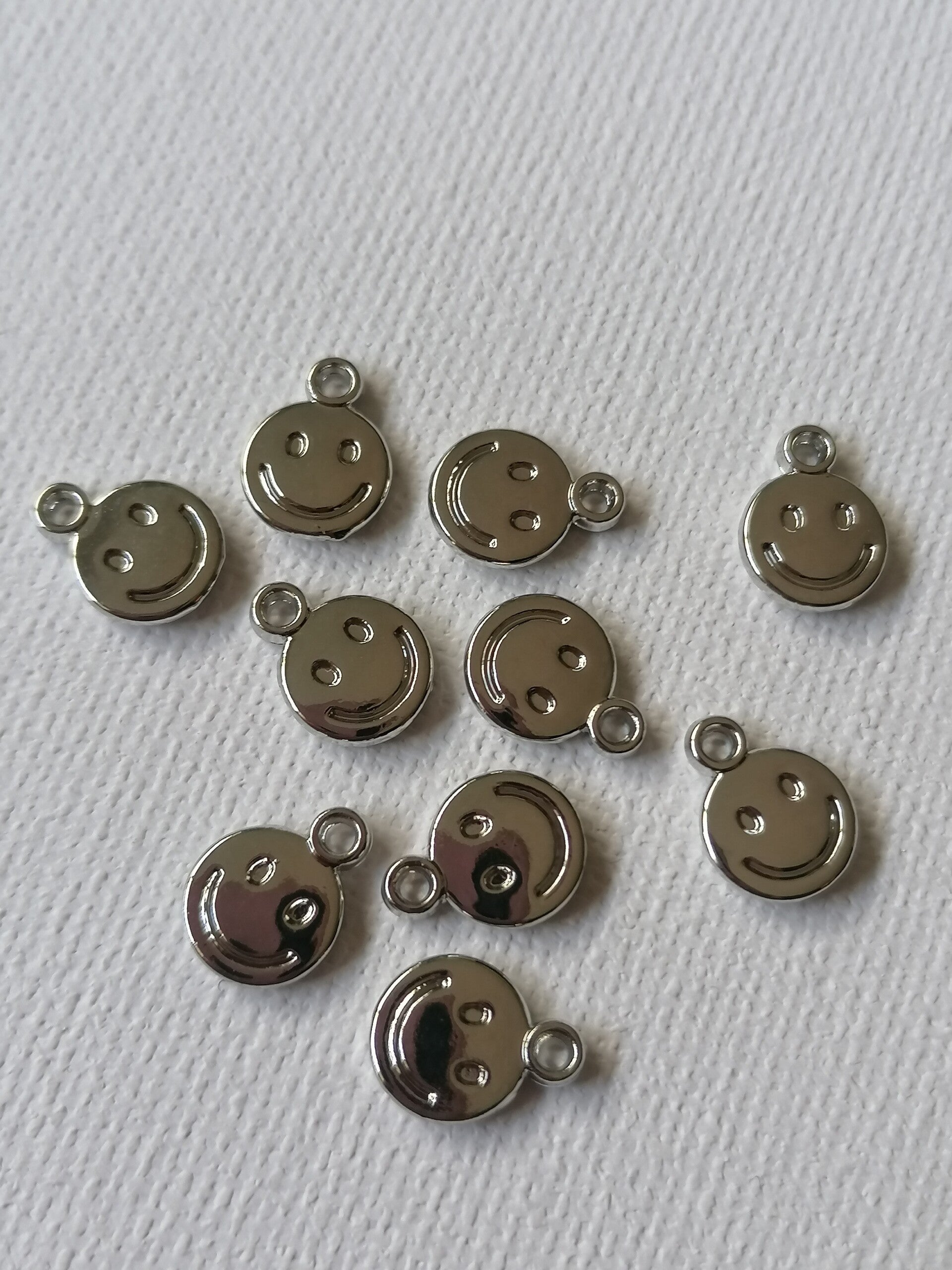 Dit zijn zilveren smiley bedels. De prijs is per 2 stuks. Ze hebben een zilveren kleur. (Als je een grote bestelling plaatst en je twijfelt of het wel door de brievenbus past stuur mij dan een berichtje op onderdelen.bymeike op insta als het niet door de brievenbuspast dan kan je dat aanpassen bij de verzendmethode)