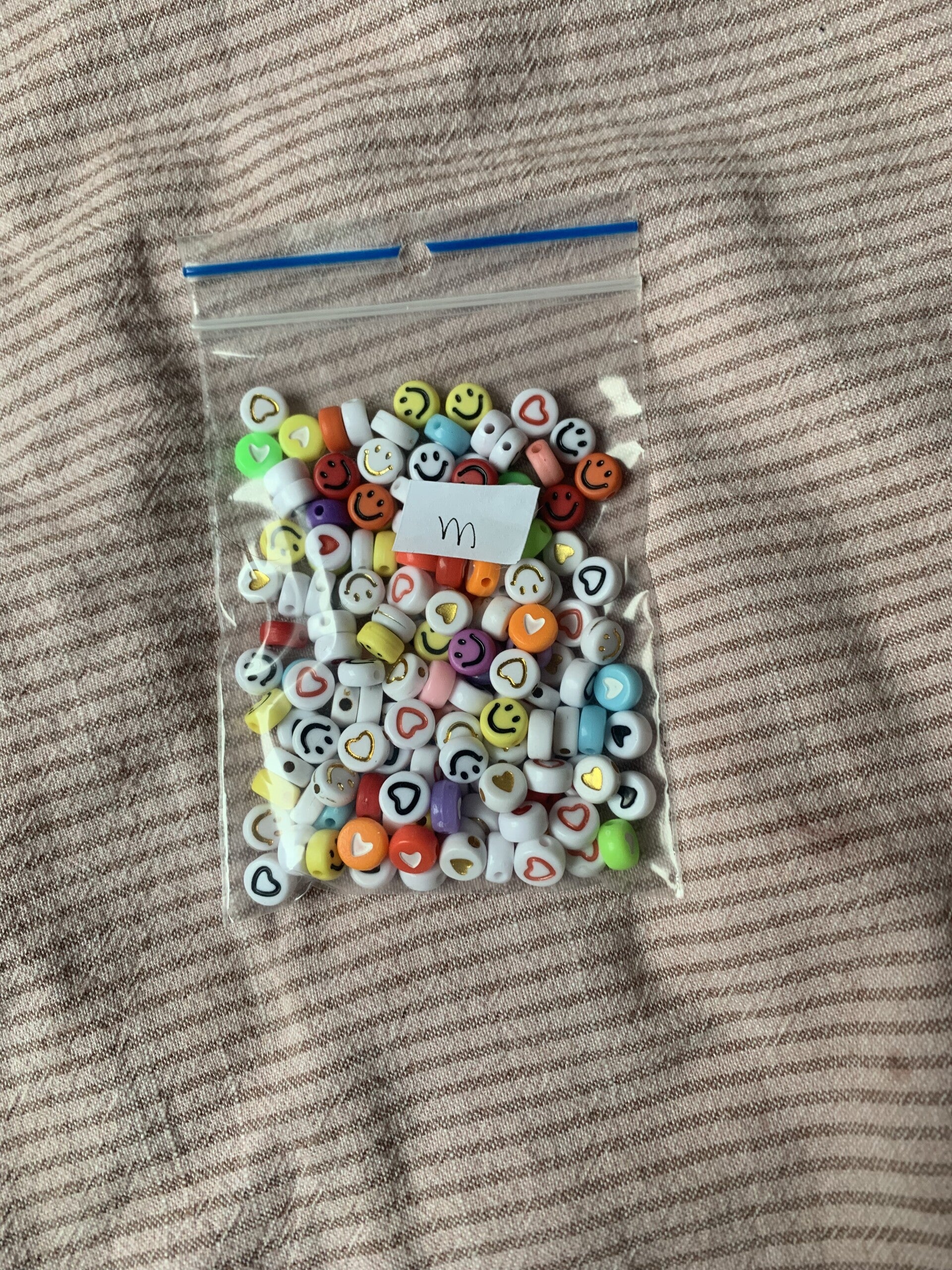 Dit zijn allemaal verschillende acryl kralen, er zitten verschillende hartjes kralen en smiley kralen doorheen! In maat M zitten 150 stuks maar ik heb ook nog andere maten!